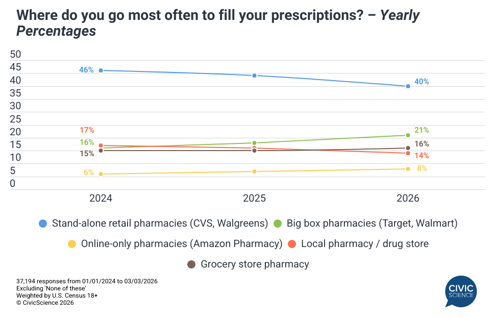 As costs continue to rise, prescription drug use in the U.S. is only growing. Sixty-nine percent of U.S. adults now report taking at least one prescribed daily maintenance medication, up one point from last year. If there’s any good news, it’s that the percentage who report taking four or more maintenance drugs fell two points during the same period. The most prolific prescription takers significantly over-index as Medicare or Medicaid users, no surprise. We also learned that a growing number of consumers are willing to cross state lines for cheaper meds, while more and more are shifting to big box retailer pharmacies and online-only services to cut costs.