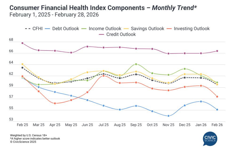 Our collective financial health has reached its lowest point in well over a year. Our February Consumer Financial Health Index came out this week, showing its second consecutive monthly drop. To be fair, the core index has been relatively steady over the past 12 months, moving within a narrow two-point band. People’s confidence in their income has been suffering the most since December, but attitudes toward household debt and investments took the steepest fall this time around.