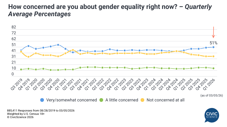 Concerns over gender inequality are on the rise, and that’s super fu—ed up. After declining since the turn of the decade – and presumably for the hundred or so years prior – the percentage of Americans who are very or somewhat concerned about gender equality has been on the rise over the past year, crossing 50% for the first time since 2020. Simultaneously, overall emotional well-being among U.S. women continues to clearly lag that of men (and thus the Gen Pop). When asked what’s most to blame for their outsized stress, financial worries, and the news/current events rank at the top. Ever the most resourceful of our fellow human beings, women are finding all manner of ways to cope.