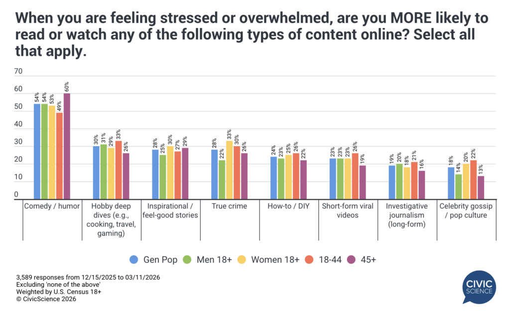 We’re also relying heavily on media to manage stress on our own. While outdoor activities and extra sleep are on the list, television, movies, and online content have become the biggest crutches for Americans looking to treat anxiety in their lives or to simply bounce back from a bad day. So-called “comfort media” – namely, watching or rewatching our favorite shows or movies – is the go-to emotional salve for 45% of Americans today. While comedy is clearly the most popular choice overall, there are notable variances across gender and age groups. Women seem to really dig true crime. Younger groups, like hobby-related shows such as cooking and travel.