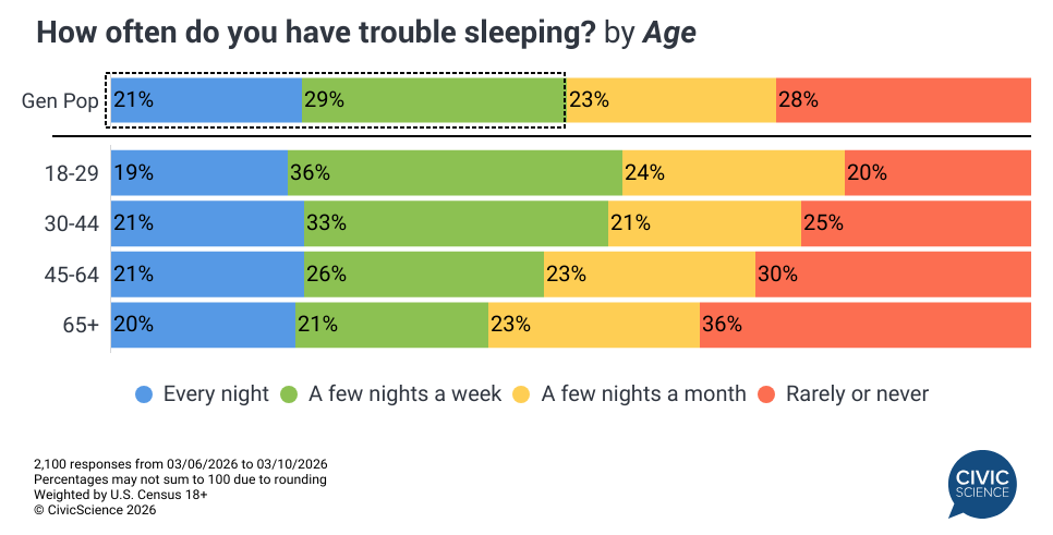 Maybe it’s because we watch so much TV, but a lot of Americans are struggling to sleep. In our latest study on sleep habits in the U.S., we found that an even 50% of adults report difficulty sleeping at least a few nights a week. Over one in five struggle every night – a notably consistent ratio across age groups, although older Americans are less likely to report sleep troubles overall. No surprise, a lot of bad sleepers claim to be in the market for a new mattress and if you’re in that general field of retail, we provided some helpful clues on how to find and win them.