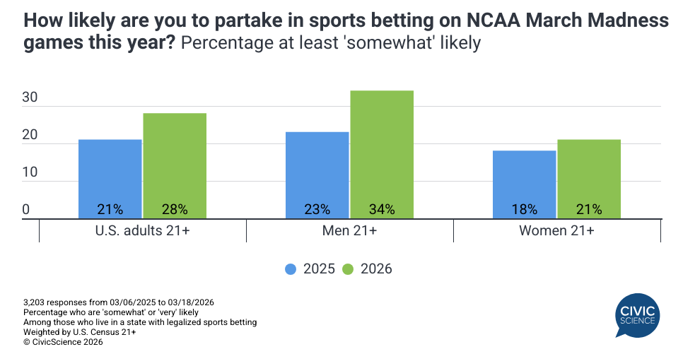 I bet you’re following March Madness this weekend. I should’ve known when Noelle hijacked my ESPN account to fill out her first-ever brackets this year. Interest in both the women’s and men’s NCAA basketball tournaments reached half-decade highs this year. It’s plainly obvious how much the trend is being driven by increased interest in gambling – the number of men aged 21+ who plan to bet on games jumped nearly 50% over last year. Another big trend is the continued move away from traditional linear TV as the viewing platform of choice. For the first time ever, more people (combined) will watch March Madness via a streaming service (29%) or digital antenna (16%) than via cable or satellite. We also looked at the purchasing proclivities of viewers, finding, for example, that Women’s March Madness viewers are over 2X more likely than the average consumer to be in the market to buy a new mattress.