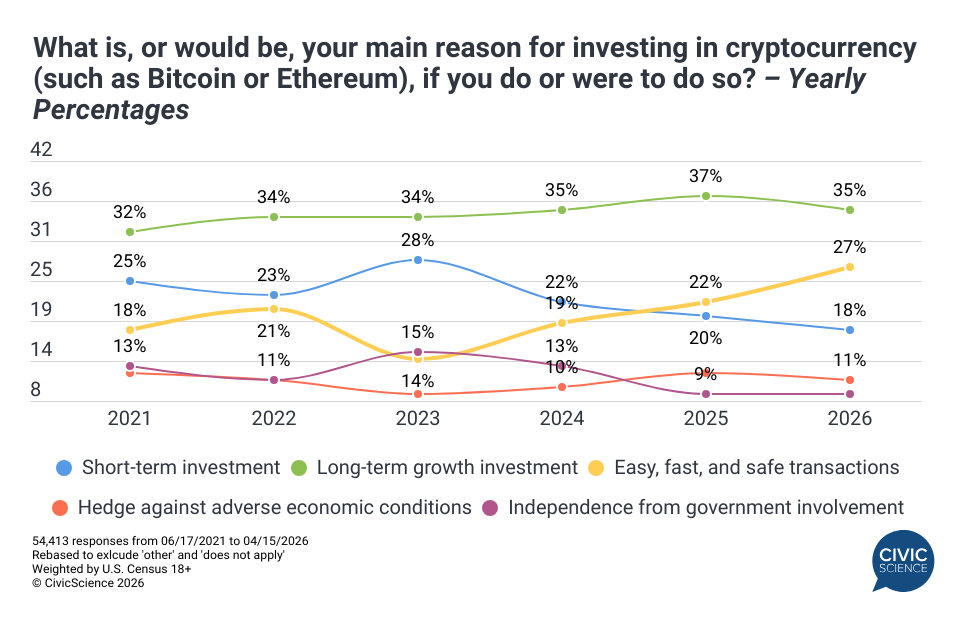 Interest in cryptocurrency is holding steady, even as the market is getting bludgeoned. Despite Bitcoin’s value falling by nearly half over the past six months, our data shows that crypto investors (and potential investors) aren’t wavering in their overall confidence. From a glass-half-empty perspective, however, interest isn’t growing either – 65% of U.S. adults have no interest in crypto, basically the same number we saw a year ago. The biggest deterrent remains a lack of trust, while the ease and speed of investing in crypto is skyrocketing as its greatest appeal.