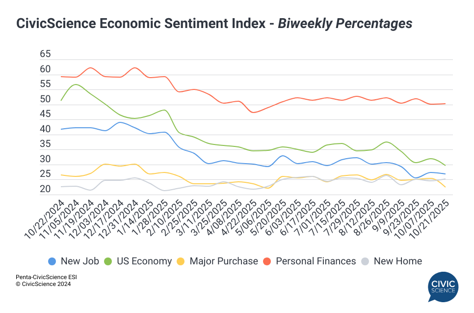 Turns out, a prolonged government shutdown doesn’t help consumer confidence. Our Economic Sentiment Index reached its lowest point in over three years this week, as a multitude of factors – pesky inflation, tightening labor markets, and Washington incompetence – weigh on Americans’ hearts and wallets. Confidence in major purchases like cars, large appliances, and furniture have taken the biggest hit, as consumers fall deeper into a wait-and-see mindset. Longer-term optimism for the U.S. economy dropped steeply as well, betraying any faith people have in our leaders to steer us out of it. I remain skeptical that these macroeconomic woes will hurt the holiday retail season too badly, because people still feel alright about their personal finances. Q1 of next year (and beyond) is another story.