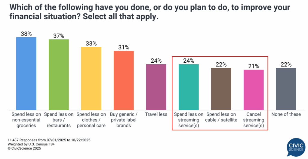 The scales seem to be tipping for streaming services. As the pace of cord-cutting has slowed this year (to be fair, it was pretty torrid to begin with), streaming subscribers are settling into new patterns of usage, fatigue, and churn. In our latest data, we found that – among existing users – a larger percentage now say they’ve canceled one or more services recently, versus those who said they’ve signed up for a new one. Still others are moving to ad-supported tiers or looking for bundles to save money. Generally, though, compared to most other spending categories, streaming services have remained relatively protected from financial headwinds.