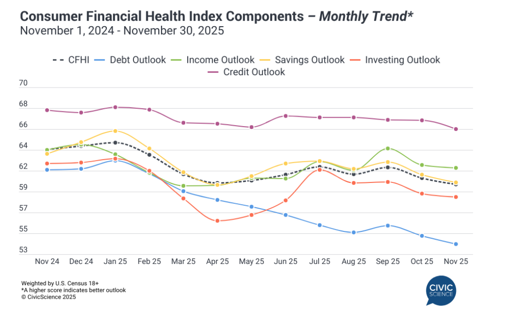 On the cup-half-empty side, Americans are feeling more gloomy about their personal financial outlook than they’ve been all year. Our November Consumer Financial Health Index was hot off the press this week, and it dipped below April’s previous low point – and remains significantly down YoY. Dour sentiment about household debt continues to be the biggest culprit, dropping for the ninth time in the last ten readings. Income and credit outlook remain above water, despite both metrics dipping last month.