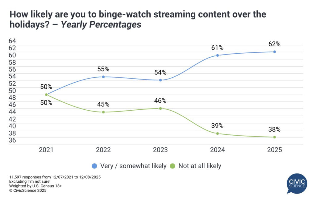People are gearing up to binge-watch a lot of streaming content over holiday break. In our Weekly Holiday Insights report, we looked at the continued rise of binge-watching as a major holiday pastime – 62% of U.S. adults now expect vegging out in front of the TV to be a central part of their plans. We also learned that the appeal of in-store holiday shopping is evolving toward more practical benefits, like being able to see and touch the products people plan to buy (as opposed to in-store deals, which drove physical shopping more in 2024). Finally, we examined the growing popularity of Advent calendars – up six percentage points from last year.