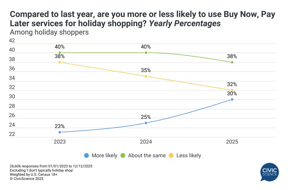 Buy Now, Pay Later will be one of the biggest stories of the 2025 holiday retail season. I feel like I’m beating a dead horse on this topic, but, in this week’s Holiday Shopping Insights we confirmed that U.S. shoppers are turning to BNPL at record levels, with those who intend to (or already did) increase their “layaway” debt increasing by over 20% YoY. We also learned that stressed-out holiday shoppers are more likely to buy some kind of subscription gift for a loved one and that last-minute gift buyers have appreciably different retailer preferences than non-procrastinators.